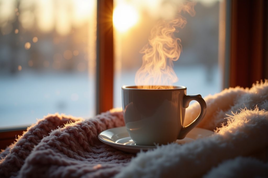 - Gemütliche Innenräume mit Winterblick: Bilder von einer warmen Tasse Tee oder Kaffee vor einem Fenster mit Schneefall, Kerzenlicht oder einem Kaminfeuer symbolisieren Behaglichkeit (Hyggelig), Sicherheit und Geborgenheit. Sie laden dazu ein, den Morgen im Warmen zu genießen und die Kälte draußen zu lassen.